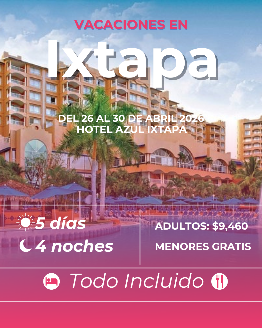 Revisa nuestros bloqueos, ya que la gran mayoría incluye a tus menores sin costo, esto te permite ahorrar y darte la oportunidad de conocer mejores hoteles sin gastar de más